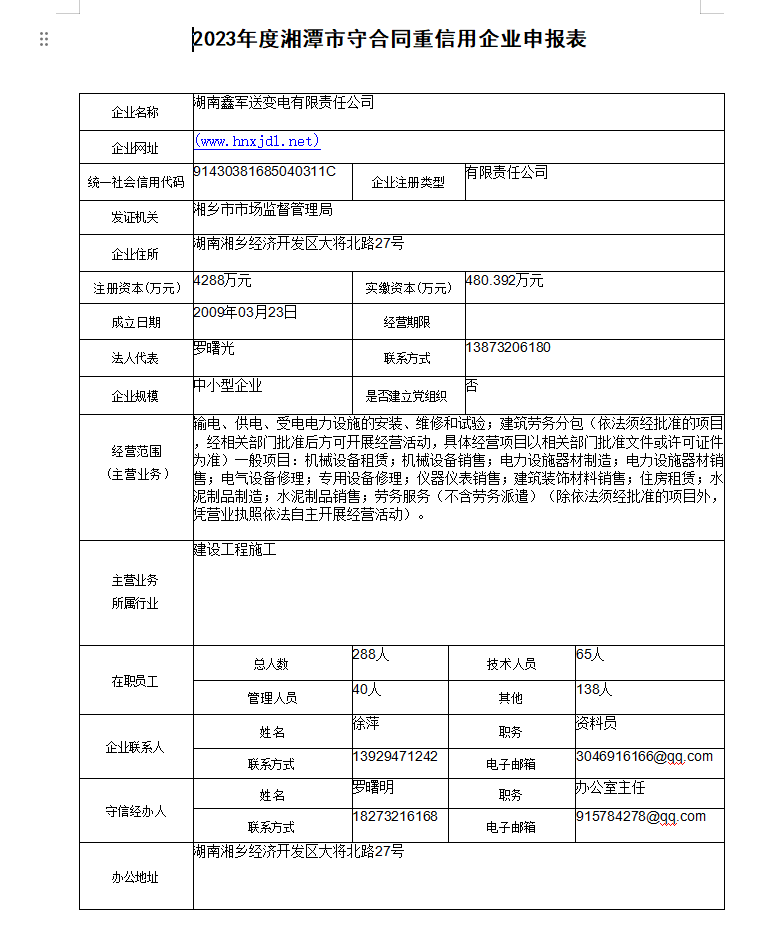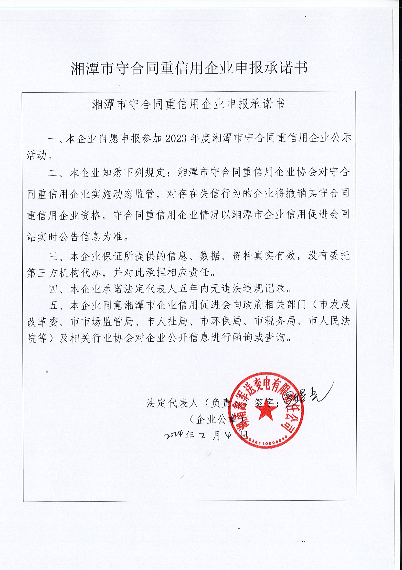 本企業(yè)根據(jù)《湘潭市守合同重信用企業(yè)申報規(guī)定》等編制 2023 年度企業(yè)信用報告書,并保證本報告書內容真實、準確、完整。