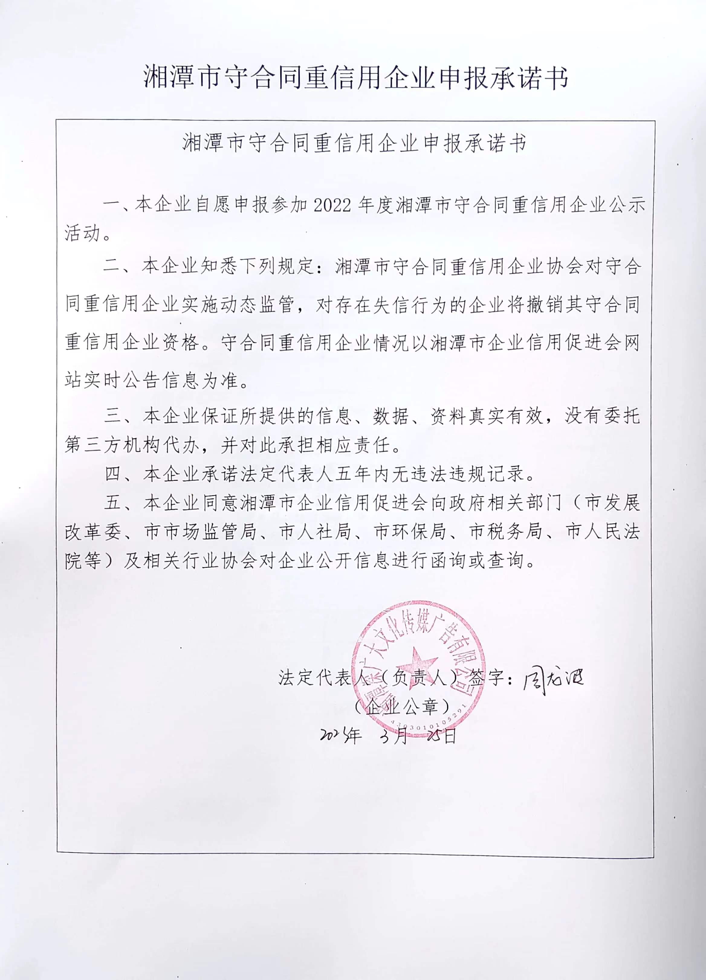 本企業(yè)根據(jù)《湘潭市守合同重信用企業(yè)申報(bào)規(guī)定》等編制 2022 年度企業(yè)信用報(bào)告書,并保證本報(bào)告書內(nèi)容真實(shí)、準(zhǔn)確、完整。