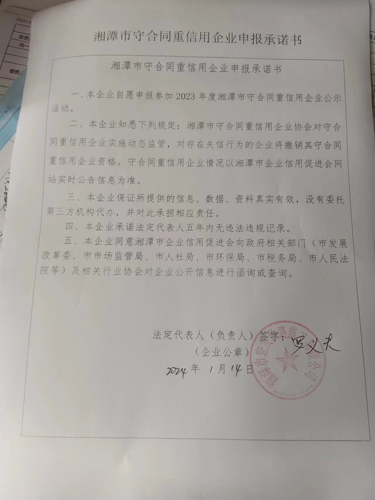 本企業(yè)根據(jù)《湘潭市守合同重信用企業(yè)申報規(guī)定》等編制 2023 年度企業(yè)信用報告書,并保證本報告書內(nèi)容真實、準(zhǔn)確、完整。